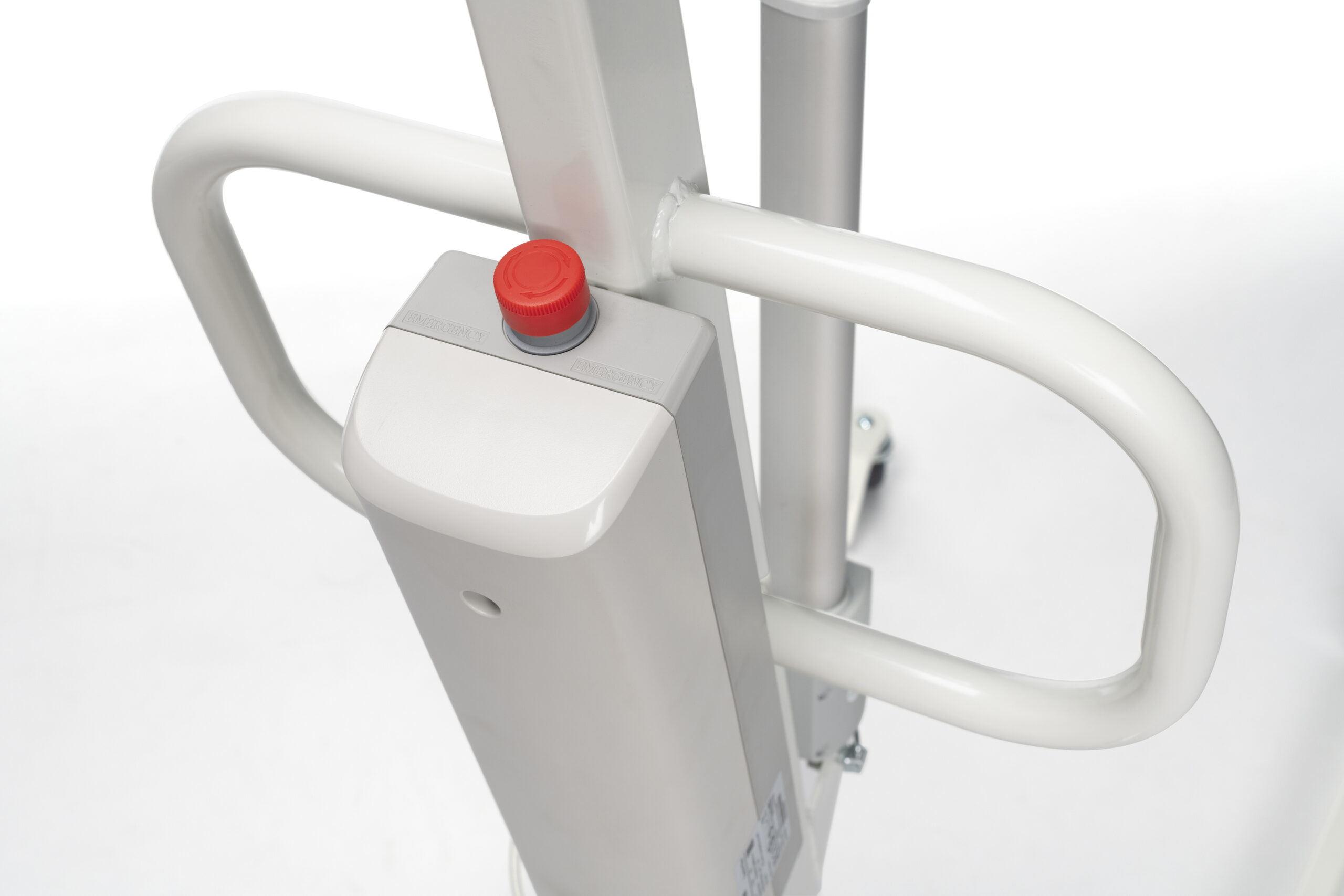 Podnośnik FALCON posiada wbudowany przycisk awaryjny, który zapewnia dodatkowe zabezpieczenie w sytuacjach wymagających natychmiastowego zatrzymania urządzenia. To rozwiązanie zwiększa bezpieczeństwo zarówno pacjenta, jak i osoby obsługującej podnośnik, umożliwiając szybką reakcję w nagłych przypadkach.