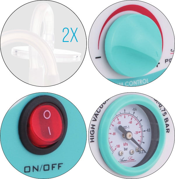 Ssak Al-03 wyposażony jest w regulator siły odsysania, zawór zabezpieczający przed przepełnieniem płynów oraz litrowy pojemnik na płyny.